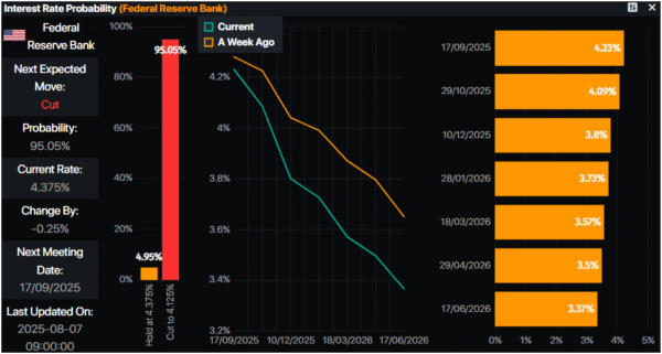 Fed Interest Rate Probabilities show that traders had priced in a 95% chance of a quarter of a percentage rate cut at the September meeting, according to Prime Market Terminal data.